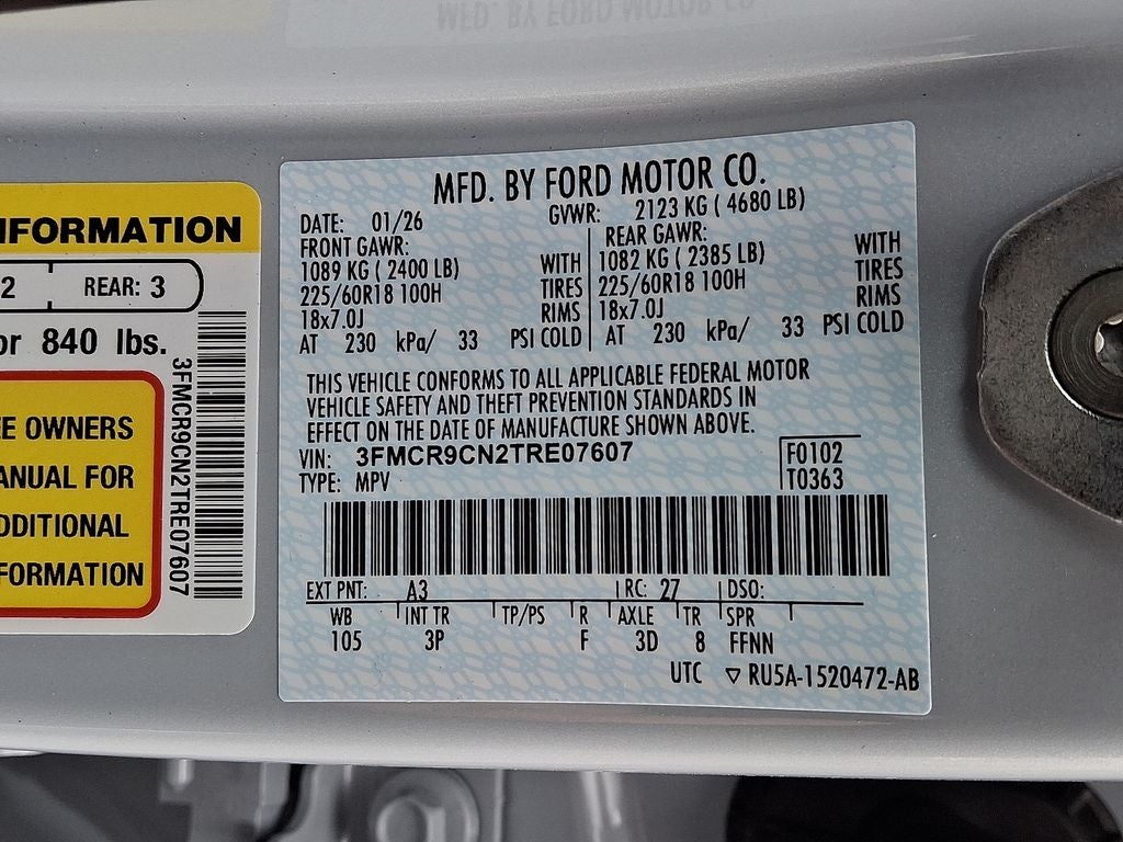 Ford Connectivity Package (1-Year Included), Internet access capable: 5G Modem - Ford Connectivity Package, 4-Wheel Disc Brakes, 6 Speakers, ABS brakes, Air Conditioning, Alloy wheels, AM/FM radio: SiriusXM with 360L, AM/FM Stereo, Apple CarPlay/Android Auto, Auto High-beam Headlights, Auto-dimming Rear-View mirror, Automatic temperature control, Brake assist, Compass, Delay-off headlights, Driver door bin, Driver vanity mirror, Dual front impact airbags, Dual front side impact airbags, Electronic Stability Control, Emergency communication system: SYNC 4 911 Assist, Exterior Parking Camera Rear, Four wheel independent suspension, Front anti-roll bar, Front Bucket Seats, Front Center Armrest, Front Driver/Passenger Seat Back Map Pockets, Front dual zone A/C, Front fog lights, Front reading lights, Fully automatic headlights, Heated door mirrors, Heated front seats, Heated steering wheel, Illuminated entry, Knee airbag, Low tire pressure warning, Memory seat, Occupant sensing airbag, Outside temperature display, Overhead airbag, Overhead console, Panic alarm, Passenger door bin, Passenger vanity mirror, Power door mirrors, Power driver seat, Power passenger seat, Power steering, Power windows, Radio data system, Rear anti-roll bar, Rear Parking Sensors, Rear reading lights, Rear seat center armrest, Rear window defroster, Rear window wiper, Remote keyless entry, Security system, SiriusXM with 360L, Speed control, Speed-sensing steering, Speed-Sensitive Wipers, Split folding rear seat, Steering wheel mounted audio controls, SYNC 4 with Enhanced Voice Recognition, Tachometer, Telescoping steering wheel, Tilt steering wheel, Traction control, Trip computer, Variably intermittent wipers, and Wheels: 18 Ebony Black. We offer all factory rebates, bonus cash, loyalty cash, college/military rebate, and finance incentives that are available. Rebates & incentives may be in lieu of special financing. Not all customers will qualify for all incentives. This price cannot be combined with any other offer. Prices are subject to change. Your only additional costs are sales tax, $800 processing fee (not required by law), tag and title fees for in which state you register the vehicle. Although every reasonable effort has been made to ensure the accuracy of the information contained on this site, absolute accuracy cannot be guaranteed.